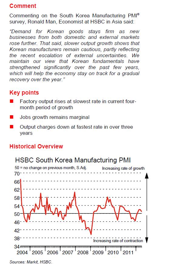 Growth of South Korean manufacturing output lost momentum in May, slipping to the weakest in the current four-month period of expansion. New order growth held up relatively well in comparison, with the latest increase only slightly weaker than in April. Meanwhile, goods producers added to their staff numbers on average, although the rate of job creation remained marginal. On the price front, output charges decreased to the greatest extent in more than three years, while input cost inflation eased to a marginal rate.