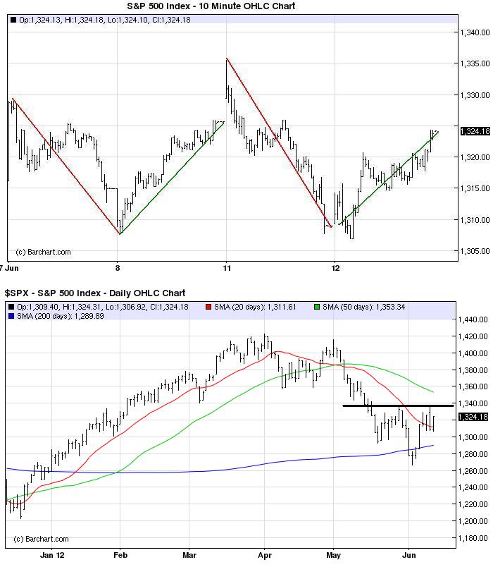 No so. After some early weakness, the S&P500 traded straight up to close on its high. Whispers of QE3 and other nonsense were given as the reason the market moved higher.