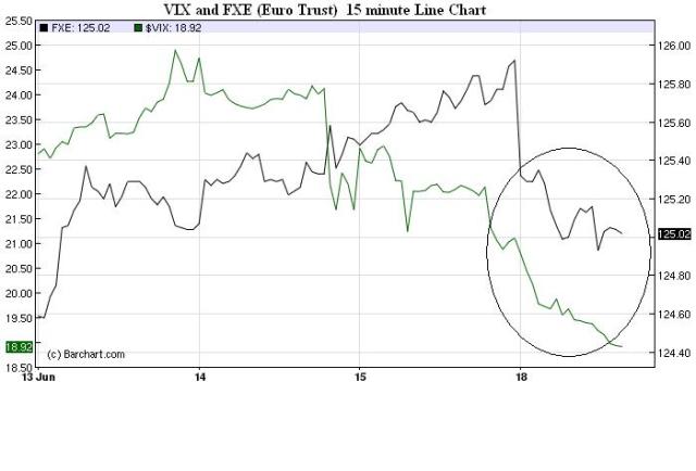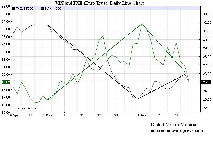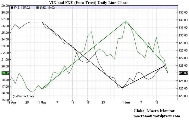 Check out the VIX and Euro both moving down today, which diverges from recent history. The VIX is down over 11 percent today, which could be position squaring before options expiration. We suspect that many got long volatility around the Greek elections.