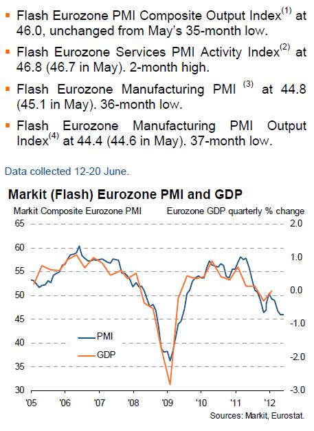“The flash PMI for June rounded off the weakest quarter for three years, indicating Eurozone GDP is likely to have fallen by 0.6%. The downturn is gathering pace and spreading across the region, with Germany on course for a marginal fall in GDP in the second quarter, though far steeper declines are likely elsewhere – including a 0.6% drop in France.“Of particular concern is the near-record deterioration in business optimism, combined with marked falls in employment and purchasing by companies. This suggests that firms are preparing for conditions to worsen in the coming months, with the darker outlook often attributed to uncertainty caused by the region’s ongoing economic and political crises.