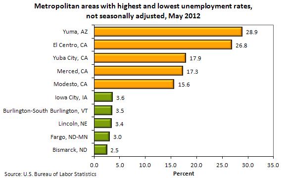 In May, five U.S. metropolitan areas recorded jobless rates of at least 15.0 percent, with Yuma, AZ (28.9 percent), and El Centro, CA (26.8 percent), recording the highest rates. Bismarck, ND (2.5 percent), and Fargo, ND-MN (3.0 percent), recorded the lowest unemployment rates among the metropolitan areas.
