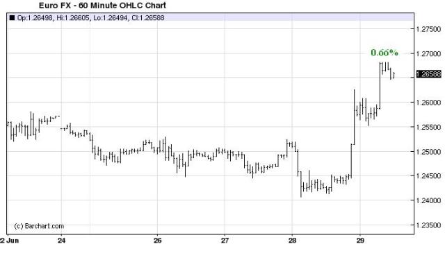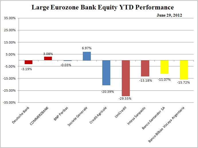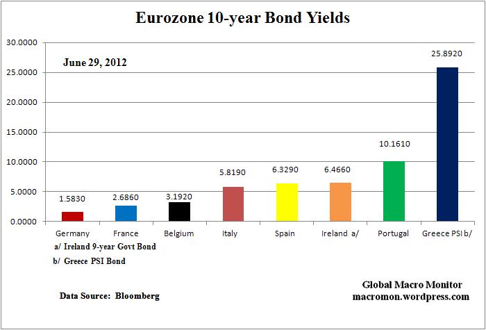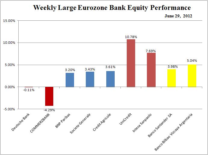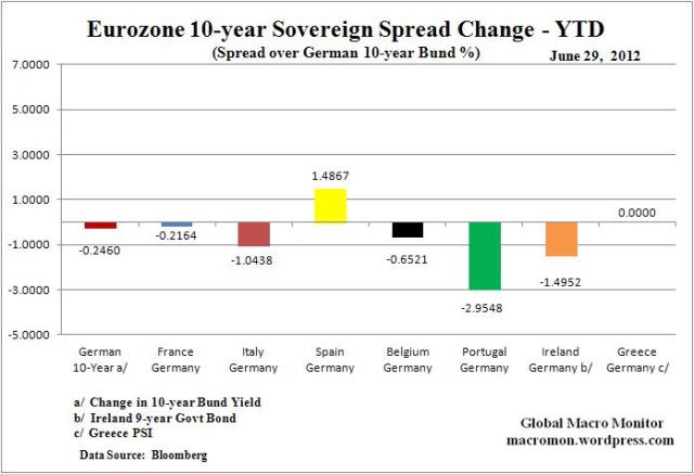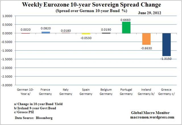 EU Summit announcements do the trick to stabilize markets. Big one day tightening in Italian and Spanish spreads which had blown out earlier in the week but not reflected in the weekly change. Irish spreads come in big on the possibility of a retroactive bailout of the financial sector relieving the sovereign of debt obligations and commitments.