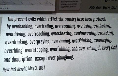 I took that photo at the Museum of the City of New York, at its exhibit on the history of New York’s banks. The quotation sure sounds a lot like some of the prose used to describe the excesses of the recent credit bubble. (Except maybe the “over ploughing” bit, now that we’re no longer an agrarian economy.)