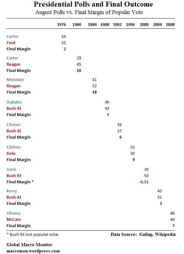 For historical context, we looked at every Presidential campaign since 1936 and the polls from the Gallup interactive site on or around August 1st of every election year. We then compared them to the final margin of the victory in the popular vote in each of past nineteen Presidential elections.