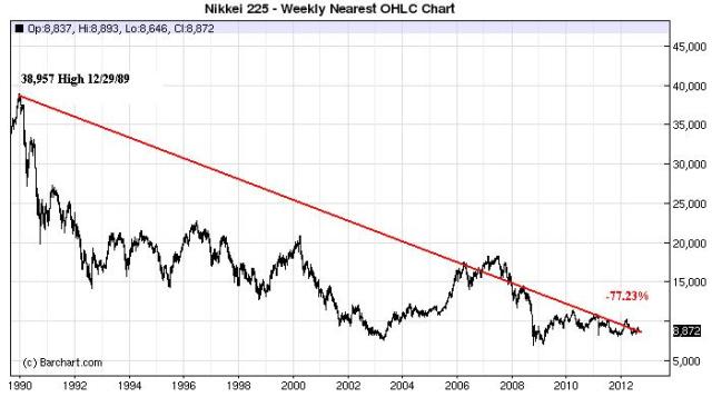 Sorry to ruin your weekend with more dismal science, but we thought this video is a reflection of the potential problems Japan is now facing. If the city of Yubari is, indeed, a glimpse of future Japan, this may be what the Nikkei has been or starting to discount. The index is still down a stunning 77 percent from its December 29, 1989 all-time high and has only managed a 27 percent bounce off the October 2008 low.