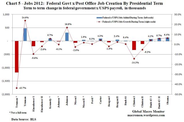 Finally, the Obama Administration has witnessed a decline of almost 700K government jobs, most of which have taken place at the local and state level. However, excluding the loss of 118K post office jobs, President Obama has expanded the Federal payroll by 6.4 percent (132K) the highest of any president since LBJ’s second term.