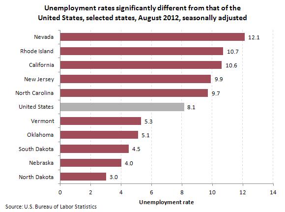 Regional and state unemployment rates were generally little changed in August. Nevada continued to record the highest unemployment rate among the states, 12.1 percent in August. Rhode Island and California posted the next highest rates, 10.7 and 10.6 percent, respectively. North Dakota again registered the lowest jobless rate, 3.0 percent.