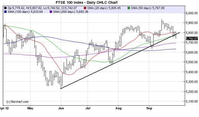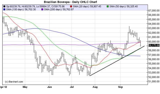 The Brazilian Bovespa gave back 3.5 percent and looks to test its short-term uptrend, which also coincides with the 50-day moving average.