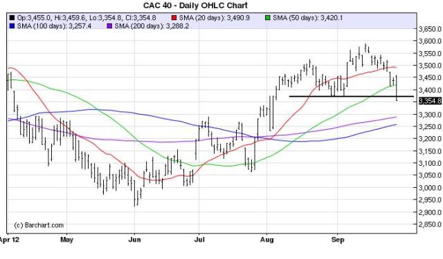France’s CAC took a big hit last week (-4.98 percent) breaking key support and its 50-day moving average.