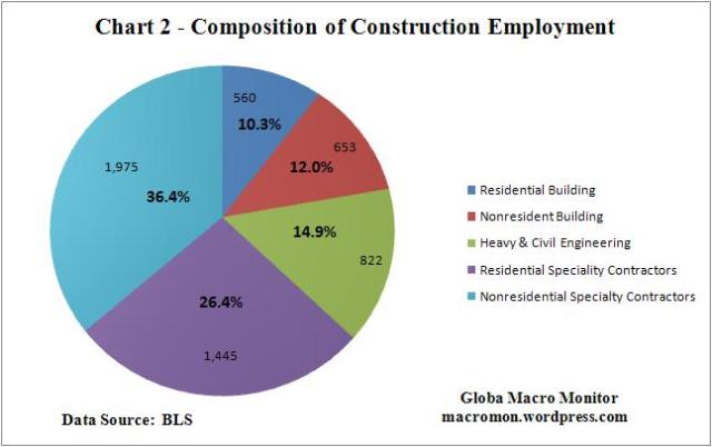 Chart 2 illustrates the composition of the construction labor force. Almost 63 percent of all construction jobs are specialty trade contractors, which include carpenters, framers, electricians, and plumbers.