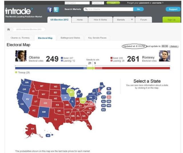 We also noticed that G0vernor Romney leads in the electoral college 261-249 with only Ohio and Wisconsin as toss ups. Wait, now its 261-259 (270 to win presidency) as Wisconsin has just moved into the President’s column (see time stamps on charts below).