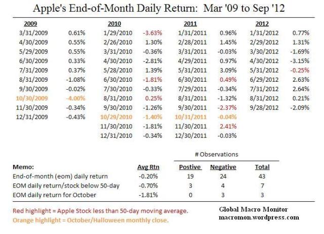 Of the 43 eom observations since March 2009, the stock has traded down 24 days and up only 19 with an average return of -0.20 percent. Controlling for when the stock is trading below its 50-day moving average, as it now is, Apple has been down 4 out of the 7 observations for an average return of -0.70 percent.