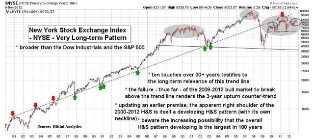 As in Head and Shoulders and the long-term technical pattern that is being hammered out in the NYSE index. We stumbled across this chart over at Bikini Analytics via SocialTrade.