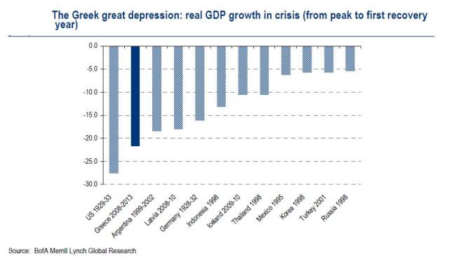 Bank of America Merrill Lynch provides an informative chart with perspective on how bad it is in Greece,