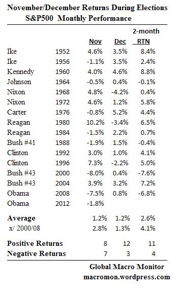 We wanted to update our table S&P500 returns post presidential elections. As illustrated, the returns are relatively positive. This is especially true if the swan years of 2000, the contested election, and 2008, during the financial collapse are excluded. Of course, in none of these years was the stock market peering down the side of a fiscal cliff.