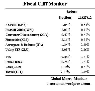 The S&P500 (SPY) finished the day down 0.51 percent with Russell (IWM) down 0.12 percent. Defense and utilities were up, gold down, dollar down, bonds up, and the VIX up another 2.7 percent. Not exactly the market you’d expect to see in panic about a fiscal cliff swan dive.