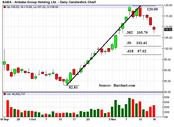 Alibaba has been selling off hard over the past week to the surprise of many, including, painfully, us. It’s now down 9.3 percent from last week’s high at 120. The stock bounced near its 20-day moving average today, closing off 1.80 percent. The 20-day moving average is at 107.08 and rising and the key Fibonacci retracement levels are shown below. Stay tuned.