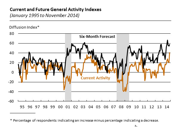Labor market indicators showed improvement this month. The current employment index rose 10 points in November, to 22.4, and hit a 3½ year high. Twenty-nine percent of the firms reported increases in employment compared with 20 percent that reported increased employment last month. Firms also reported higher work hours, with the average workweek index rising from -1.3 to 7.8 this month.
