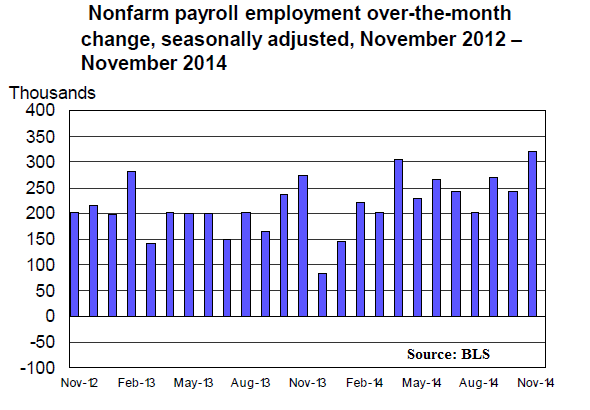 Total nonfarm payroll employment increased by 321,000 in November, and the unemployment rate was unchanged at 5.8 percent, the U.S. Bureau of Labor Statistics reported today. Job gains were widespread, led by growth in professional and business services, retail trade, health care, and manufacturing