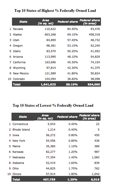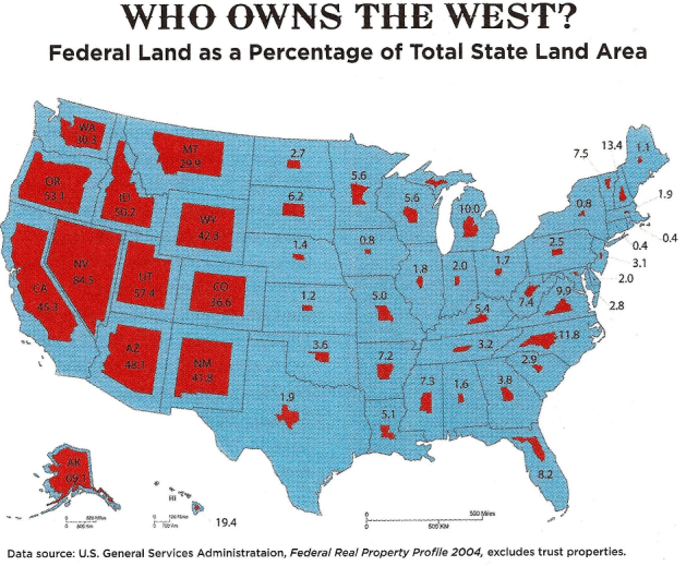 Just take a look at the chart and tables below, however, which we snagged from the Big Think, of how much land the federal government owns, especially in the west.   Almost half of the land in California and more than 80 percent of Nevada.  Stunning.