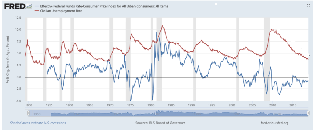 Other than 2018, a negative real Fed Funds rate with a corresponding unemployment rate under 4 percent has only occurred once in the last seventy years (see chart).