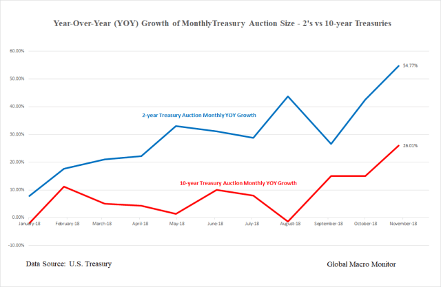 Nevertheless, take a look at the dramatic growth in the size of this year’s monthly Treasury auctions. The total gross issuance of coupon notes/bond, the 2-year FRN, and TIPs, increased 35 percent from last November, growing from $187 to $252 billion.