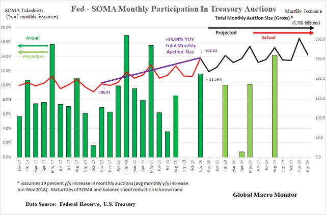 The FED’s SOMA portfolio took down 11.59 percent of the November auctions with the refinancing of its maturing Treasury portfolio in excess of the $30 billion quantitative tightening cap. Through 2019, however, the Fed will be participating in only 4 of the 13 monthly auctions even as the Treasury’s financing needs continue to grow.