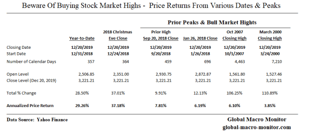 The data illustrate the returns if you had jumped in at prior market tops and bull market peaks. If you had bought the S&P500 at the feeding frenzy just after a Greenspan juiced Y2K liquidity injection (sound familiar?), for example, as many that I know did and even held it until Friday’s close, your annualized return would be 3.85 percent before divies. A fricking dismal return.