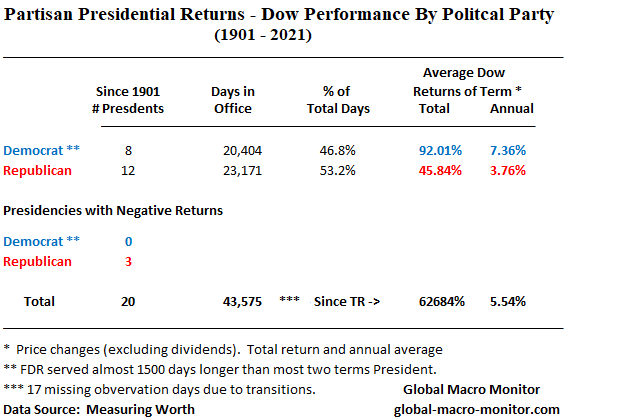By the way, the last time Carol K. posted the following table we had some pushback on when should the clock start ticking to measure presidential returns: a) Election day, or b) the Inaugural?