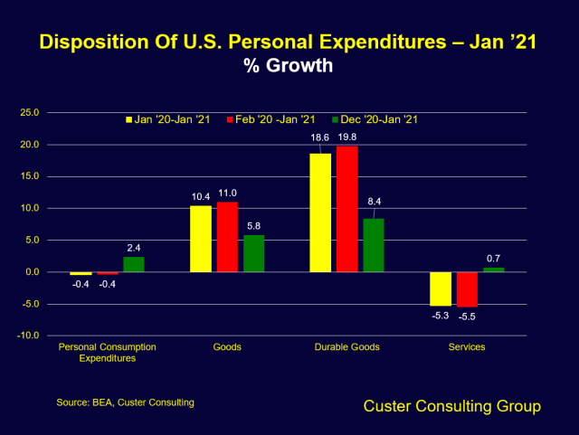 The following chart illustrates the unexpected shift in consumer expenditures from services, which made up around 70 percent of personal expenditures before the pandemic. The reallocation of spending to durable goods is contributing to the supply chain difficulties and shortages in industries, such as semiconductors and global shipping.