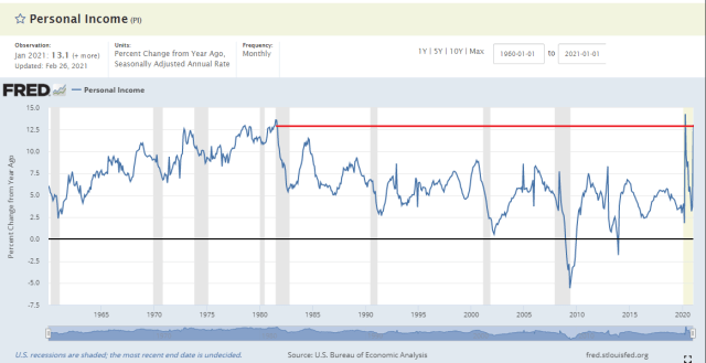 Personal income, which consists mainly of wages and salaries, rental and investment income, and government transfer payments, such as the latest COVID stimulus payments, is growing at its fastest pace in nearly 40 years. Some context, however, the 12 plus percent PI growth in the early 1980s took place with CPI inflation running at 10-15 percent year-on-year.