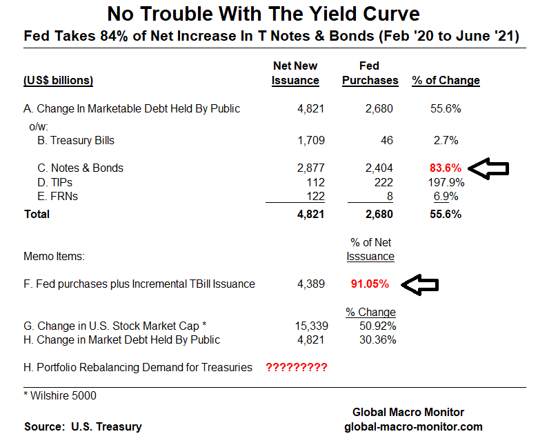 Add the $1.7 trillion of net new issuance of T Bills, with the stock increasing from $2.6 trillion (15.2 percent of marketable debt) in February 2020 to $4.3 (19.7 percent) and that takes care of over 90 percent of the deficit. Easy money, no pressure on the yield curve.