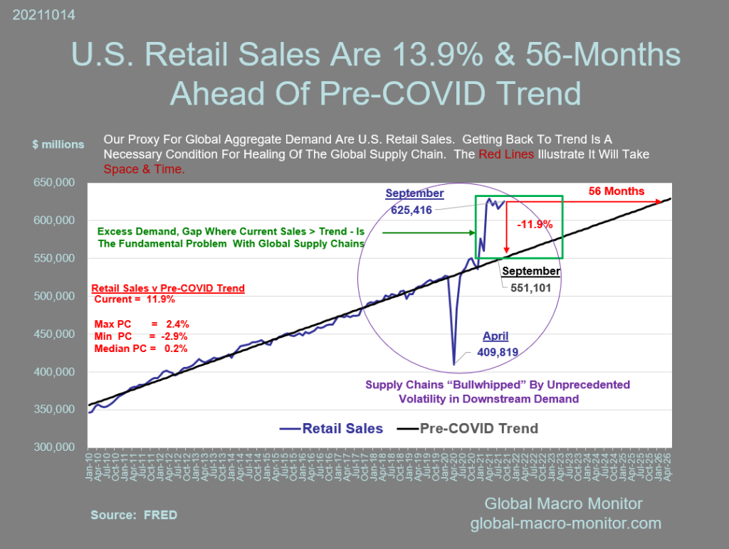 [September] retail sales – our proxy for global aggregate demand, which is not observable, by the way – are 13.9 percent above and running 56 months ahead of its pre-COVID trend. Retail sales are inflated by the policy measures and will need time (56-months of zero growth) and/or space (-11.9% down from current levels) to get back to trend. No doubt, it will be a combination of both time and space. A sharp, abrupt correction in retail sales could be painful and confuse the supply chain even further.