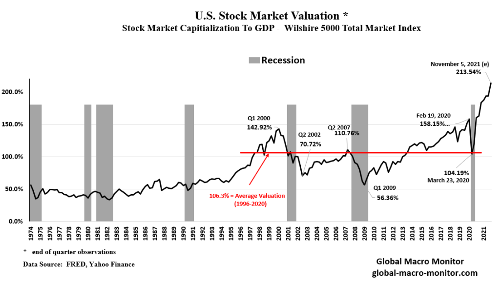 Bezos, Musk, and Branson (BMB) are not the only ones to recently touch the earth’s thermosphere for a brief and shining moment; take a look at today’s stock market valuation.  Note the structural shift, which took place around 1995. Before the mid-1990s, valuations traded in a nonvolatile range of around 50 percent of GDP.