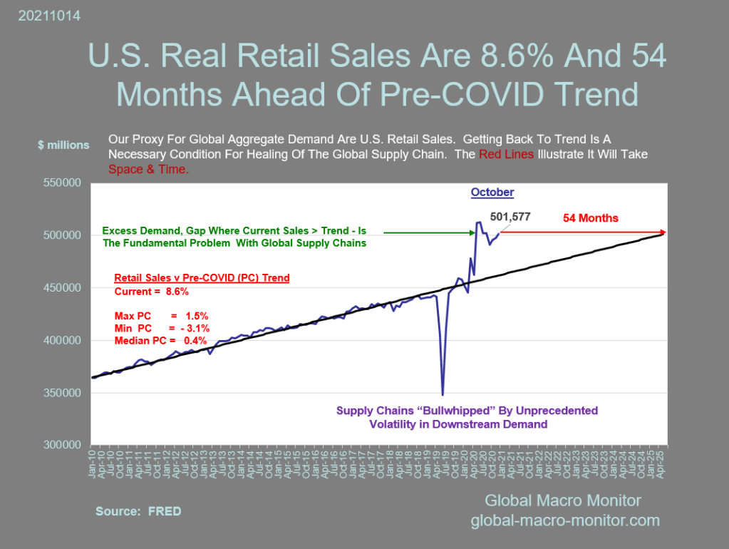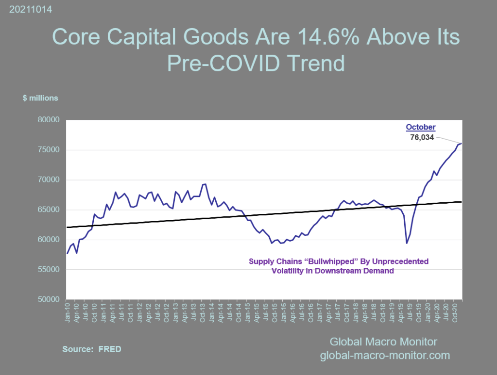 The following charts clearly illustrate the U.S. economy is overheating and is a major contributing factor to inflation. Nominal retail sales and core capital good shipments remain 15 percent above and years ahead of their pre-COVID trend. Think of the trend line as the supply curve.