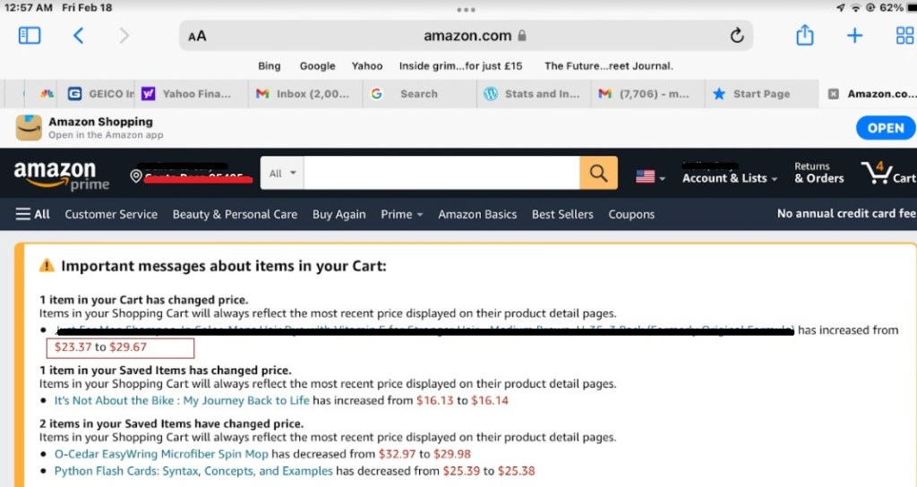 I woke to a ping on my iPad the other night to the following message from Amazon warning some prices in my basket had gone up overnight and gone up big. I am certainly not going to reveal my monthly hygiene product, but you get the point.