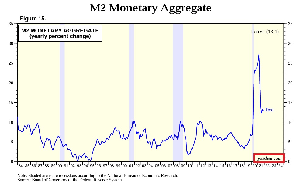 M2 (thanks to the great Ed Yardeni for the charts) is still growing over 10 percent, in the U.S. and most other major economies are or have also experienced rapid money growth. This monetary aggregate is a feeble measure of “money,” which is now almost impossible to define in our age of rapid technological change.