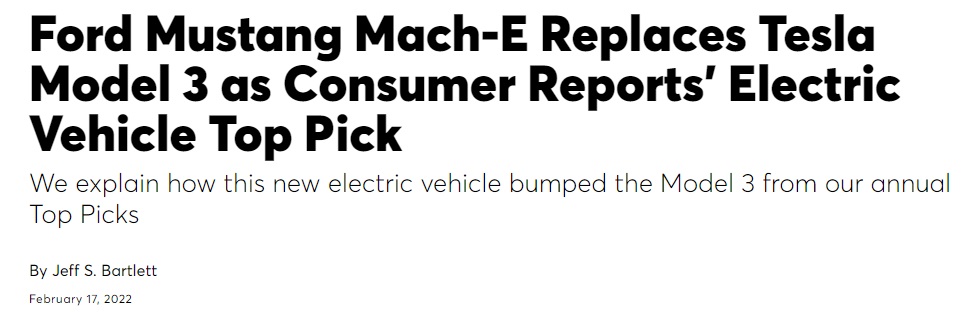 In its annual Top Picks, Consumer Reports highlights the standout cars, SUVs, and trucks across in 10 distinct categories. Tesla has dominated the electric vehicle category, with the Model 3 holding the EV Top Pick honor for the past two years. But now the Ford Mustang Mach-Ehas earned the accolade based on its Overall Score, which factors road-test score, predicted reliability, owner satisfaction, and safety. – Consumer Reports