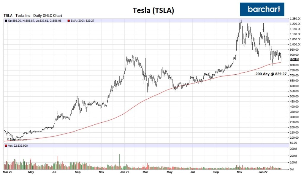 Tesla (TSLA), the poster child of the latest leg of the bull market, which began in March 2020, is again testing what has been its unpenetrable support at the 200-day moving average. The stock has to hold here. Maybe, maybe not.