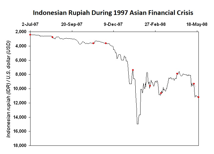 During the 1997 Asian Financial Crisis, Indonesia was hit hardest. The economic and political chaos that ensued forced Indonesia’s Suharto government from power in May 1998, after ruling unopposed for 31 years. Something that domestic political pressure and periodic military unrest could not.