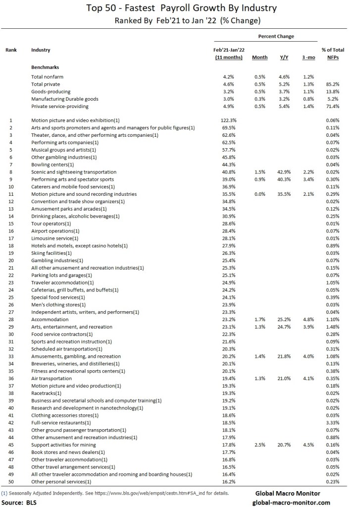 We’re providing a deeper dive into Friday’s payrolls report with the Top 50 industries with the fastest and slowest payroll growth. It’s still difficult to discern any new trends or secular shifts in the makeup of the payroll data. Most of the Top 50 industries with the highest growth in payrolls appear to be in those hit hardest by COVID.