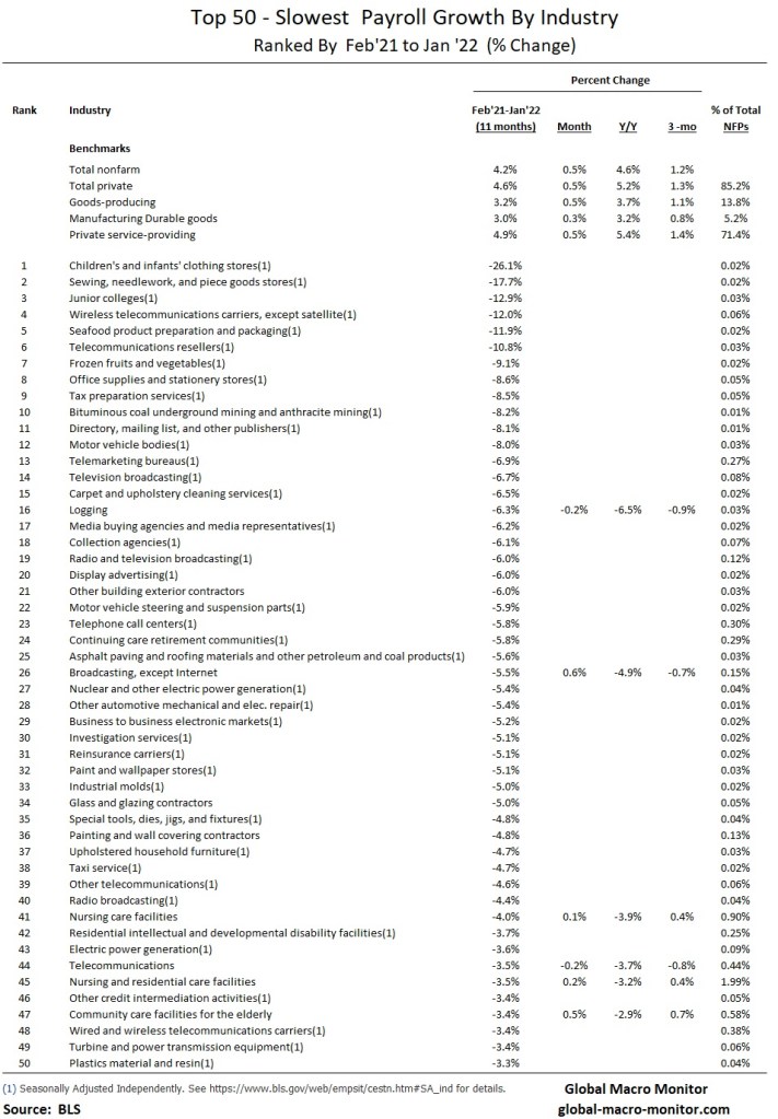 Payrolls are still in bounce mode, but the 50 industries with the slowest jobs growth deserve a closer look and deeper analysis. Our priors are that many of these sectors experiencing job losses in such a strong labor are Woolly mammoths headed for the tar pits.