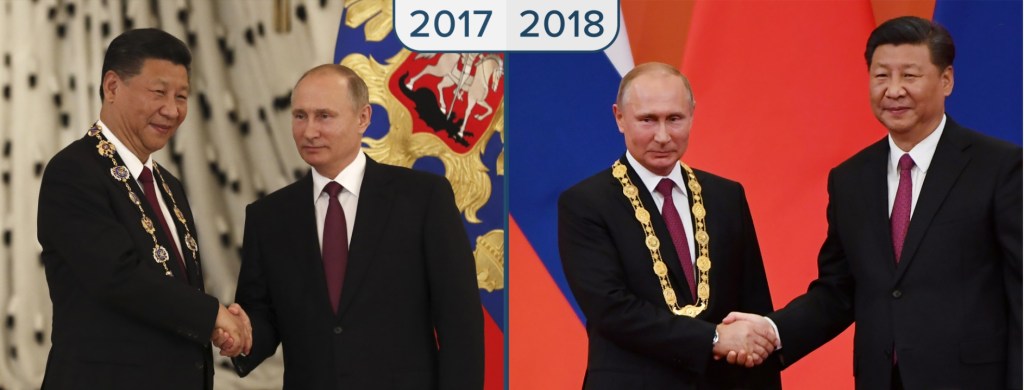 Left: Russian President Vladimir Putin (R) shakes hands with his Chinese counterpart Xi Jinping after awarding him with the Order of St. Andrew the Apostle the First-Called during a meeting at the Kremlin in Moscow, Russia July 4, 2017. REUTERS/Sergei Ilnitsky/Pool | Right: Chinese President Xi Jinping (R) congratulates Russian President Vladimir Putin after presenting him with the Friendship Medal in the Great Hall of the People in Beijing, China June 8, 2018. Greg Baker/Pool/via REUTERS