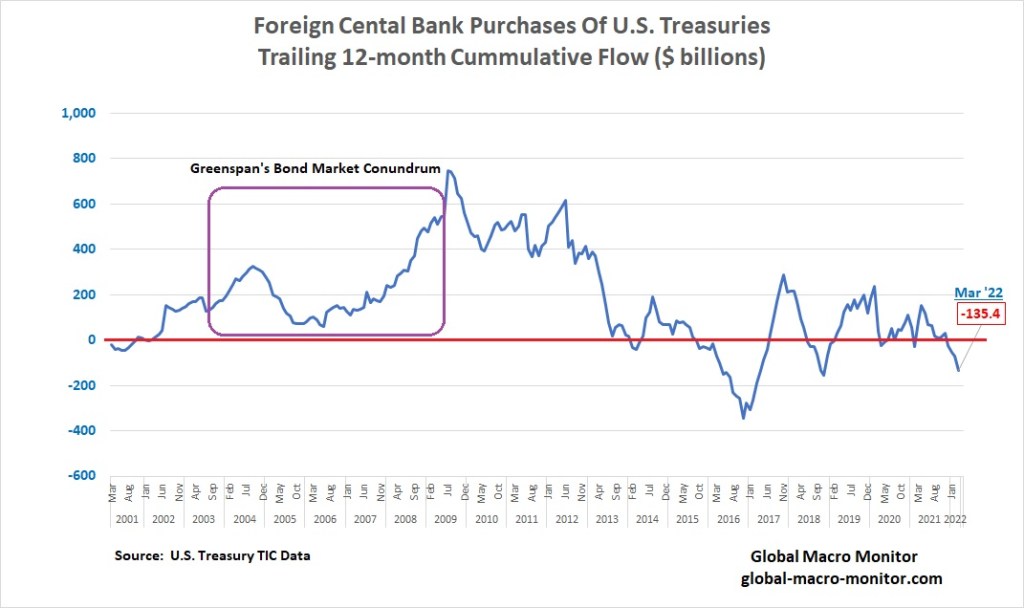 Recall, Greenspan partially blamed the Fed’s loss of control of the yield curve during its 2004-06 tightening cycle on foreign central bank inflows into the Treasury market, which repressed long-term rates and kept the housing bubble raging even as the Fed raised the Fed Funds rate 425 bps.