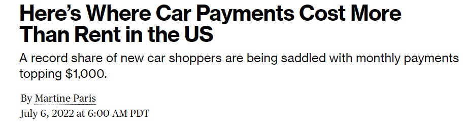 A record share of new car shoppers are being saddled with monthly payments topping $1,000, according to June data from Edmunds. That’s higher than the average cost of rent in 24 US metro areas on the Zumper National Rent Report. Meanwhile, the average monthly car payment reached $712 in May, according to Cox Automotive. That’s higher than rent for one-bedroom apartments in cities like Wichita, Kansas, and Akron, Ohio. – Bloomberg