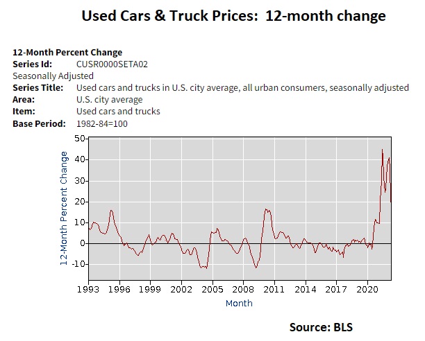 The coming deflation – yes, lower prices and not “disinflation“, which in the words of Wolf Blitzer, is “happening now” – in used car prices will dampen CPI inflation on the margin, even though they are only about 4 percent of the CPI basket.