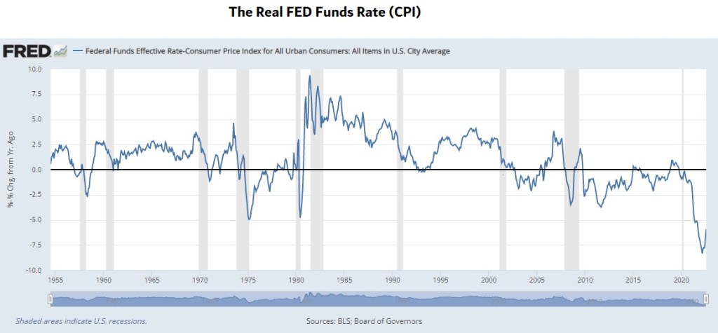 Even after today’s 75 bps hike, the real Fed Funds rate (see chart below) remains at about -5 percent. Note from the chart the economy has never kicked into a recession with a negative real Fed Funds rate. It’s amusing to watch the market watchers muse over how big a recession the Fed will create.