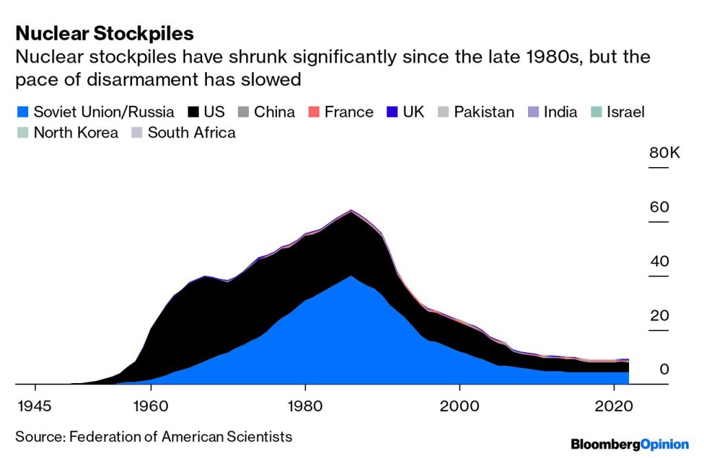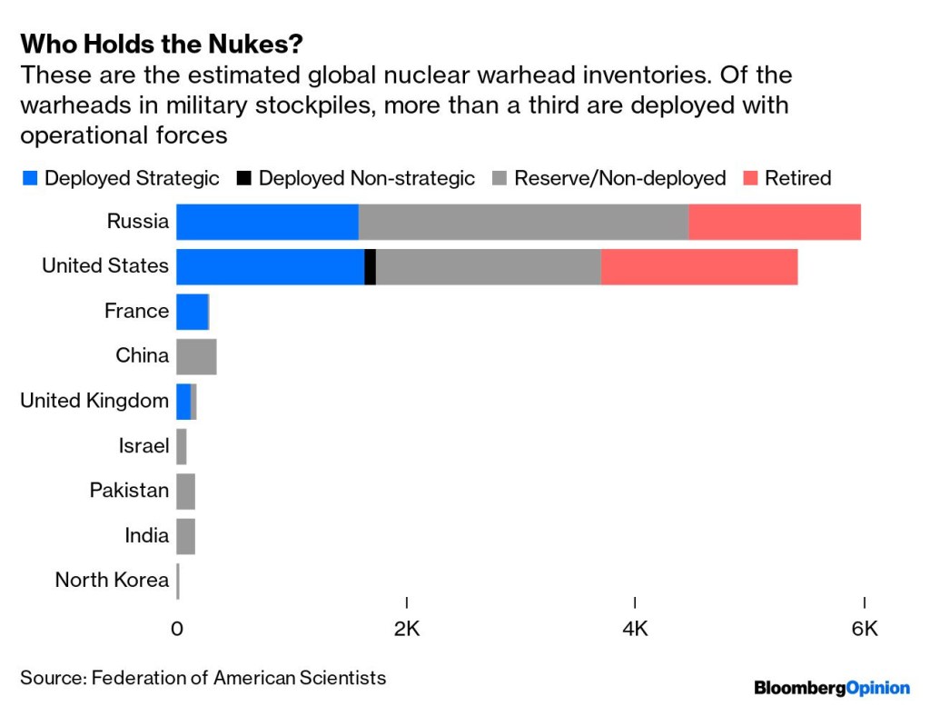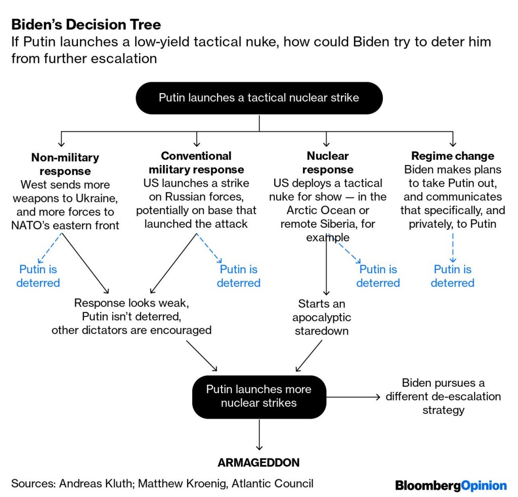 There are plenty of reasons to suggest that he wouldn’t. A tactical nuclear strike wouldn’t do much to advance his war effort; holding freshly nuked territory isn’t an attractive proposition; and fallout might blow back into Russia. Yet Hal Brands believes it’d be wise to take the threat seriously. Using a nuke might not actually backfire: Those desperate to end the fighting immediately may be willing to make concessions to Putin. Retaliating with nuclear strikes risks an escalatory spiral. Plus, as Leonid noted in a Twitter Space with Clara Ferreira Marques and Bobby Ghosh on Thursday: “If [Putin] loses, he’s finished and it’s not going to be very nice for him.” At this point, Putin may be willing to do anything to ensure survival.