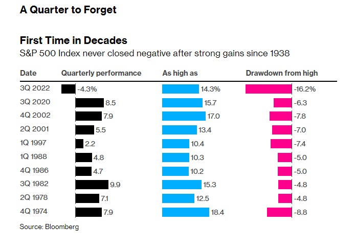 The third quarter will also get its place in the history books for one of the biggest reversals: It is the first quarter since 1938 that the S&P 500 Index closed in the red after gaining more than 10%.