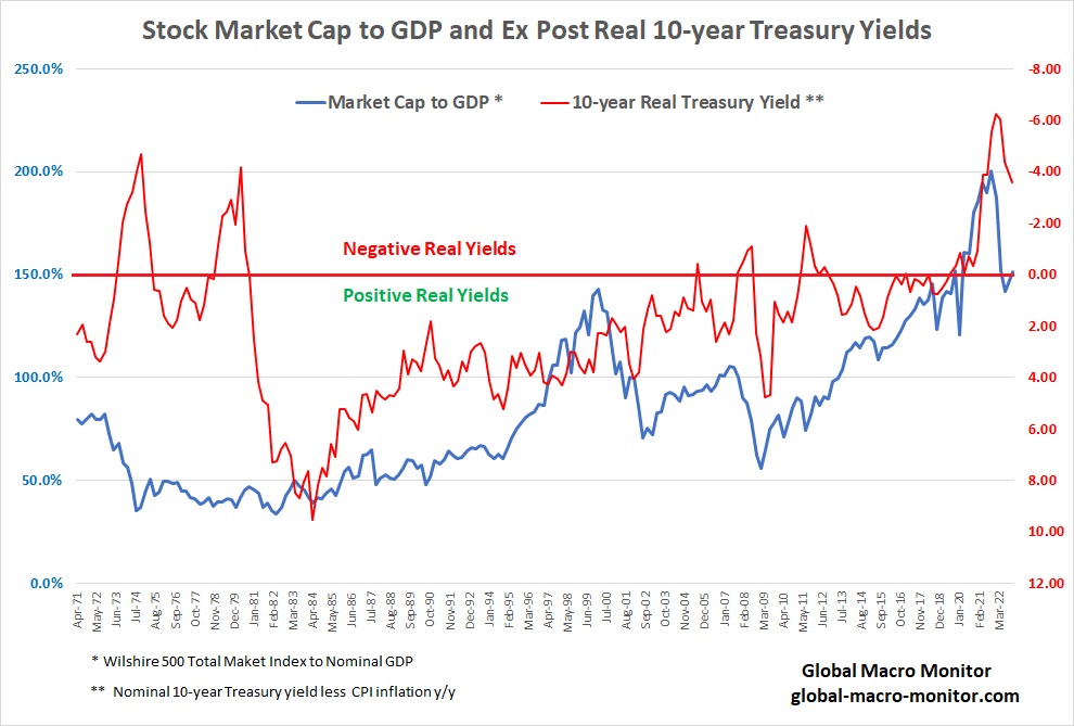 The following chart illustrates an excellent heuristic and simple (if not too simplistic) illustration of longer-term stock market valuation moves. Note how the stock market’s capitalization has significantly outpaced nominal GDP — never sustainable — since the nadir of the Great Financial Crisis (GFC). In contrast, the ex-post real 10-year Treasury yield has fallen from 4.76 percent at the end of Q1 2009 to -6.24 percent at the end of Q1 2022.